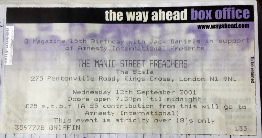 I was sceptical as to whether this online shipping thing would actually work, but much to my relief my ticket arrived in the post a few days after I got back to London, and so off I strode this strange September night to the Scala. I don’t recall any mention on the night of the bizarre times we suddenly had been thrust into, from either the comperes or the Manics themselves. But everyone in the crowd seemed more than usually ready to go absolutely wild for our favourite boys, perhaps in an effort to rid our minds of the intense fuckery that the 21st century had just swerved into. From my diary: