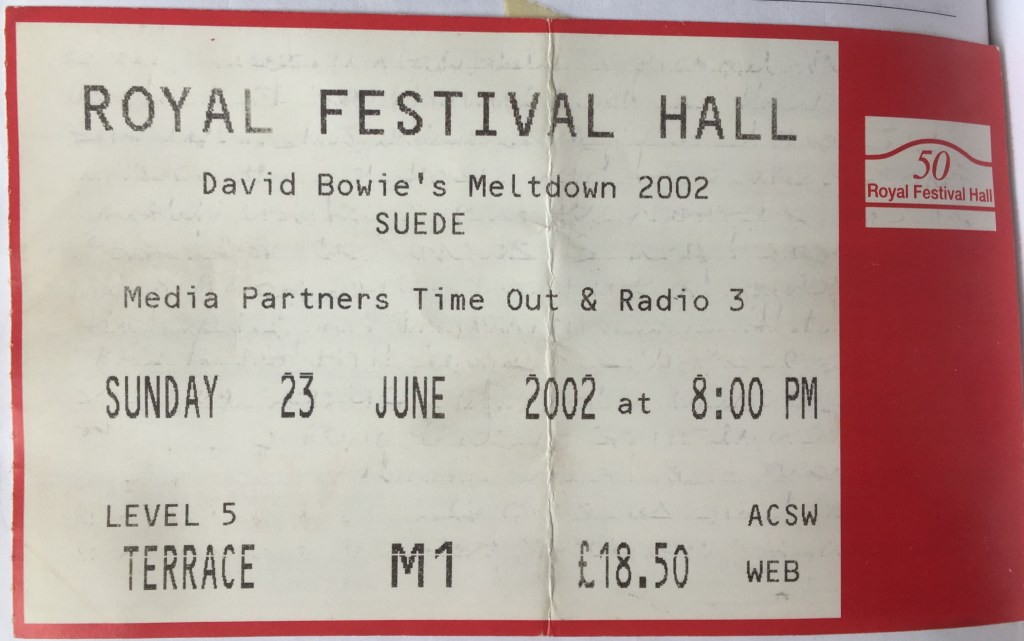 And things were soon to pick up for me even further. This gig was part of David Bowie’s curation of the Meltdown season of gigs held by the Southbank Centre every summer. And much as I adored Suede, it was nothing to how much I idolised David Bowie. I still hadn’t seen Bowie live at this point, and had tried and failed to get a ticket for Bowie’s own Meltdown show. But there was at least a little Bowie treat in store for me at this show.