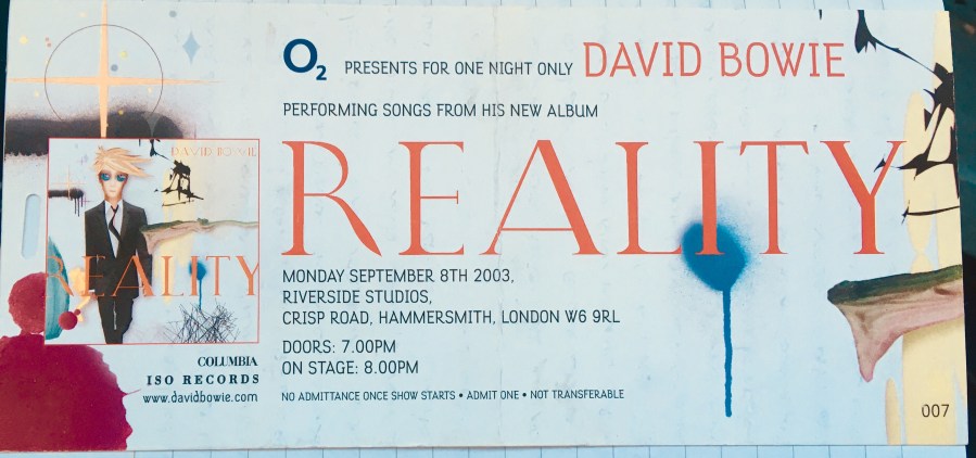 By 2003 – even though I was now adult enough to own a credit card myself – I’d pretty much assumed I’d never see Bowie live. I certainly wasn’t expecting a massive new album campaign with a world arena tour attached, and when the November 2003 Reality tour was announced that June, my excitement knew no bounds. I immediately snapped up tickets for every gig in England – one in Manchester, two in Birmingham and two in London.