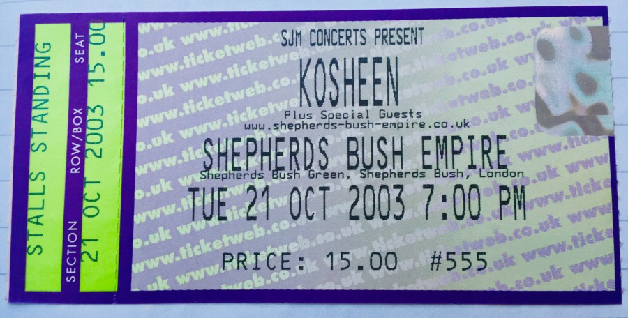 So, when it came to this Kosheen gig, and the Darkness gig I went to the following night, I was far too distracted by my new geeky fannish activities to write more than a couple of words in my diary. And the words I wrote for Kosheen were this: ‘thoroughly underwhelming‘. Ouch.
