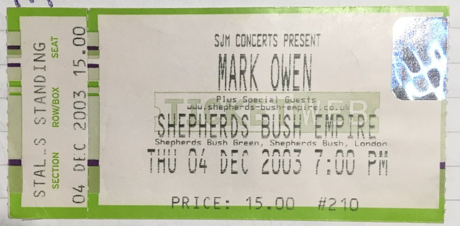 Until then, I’ll have to make do with my memories of 2003, and the joy of seeing out my gigging year at this concert, with the dazzlingly wonderful pop genius that is Mark Owen,