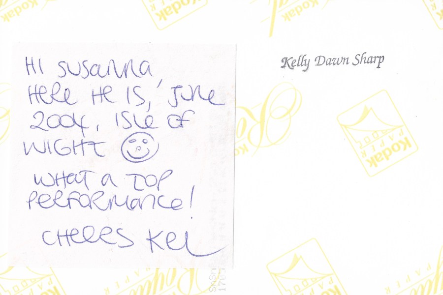 It’s not quite the in-depth record I wish I had for this gig, but it will have to do. However, I do have one further memento from this day. As well as my Italian gig buddy, I made another new acquaintance that day. I’d found myself just in front of a lady in the crowd who was grappling with a huge professional camera, and she asked me if I’d mind letting her in front of me for a few songs so she could take some photos. I did so, and as a thank you, she later sent me the following picture from the night in the post, with the attached note:
