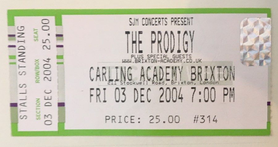 I’d had the chance to see them way back in 1997, at day two of V97, but I was not feeling very gigtastic on that grim rainy day, and so had gone home early. Now, in 2004, it was time to rectify that error. Setting out for Brixton on this wintry evening I was for the second time accompanied by my Glam Best Friend, and we had a thrilling night of leaping about and screaming to the huge tunes and formidable spectacle of the Prodigy ahead of us. From my diary: