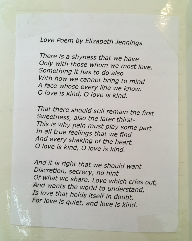 …and then failed entirely to write anything about it in my diary. I don’t even have the ticket stub – I imagine it was taken away from me at Manchester Arena. All I have in my diary from this second gig is the poem that the Manics had displayed during their pre-show montage – “Love Poem” by Elizabeth Jennings – which had moved me so much that I’d subsequently googled the few lines I could remember and printed out a copy of it.