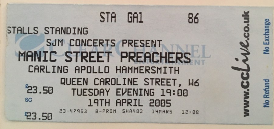 But in the context of this blog, where I’m reflecting on my entire gigging life, it seems to take on an extra meaning just for me. The gig where this was handed out was probably the last one where I considered the Manics to be the most important thing in the world to me. And this Manics tour was also the last one where I would go to every London date. By the time their next tour rolled around in 2007, I only managed one show despite there being three in London – a decade previously, this would have been unthinkable to me.