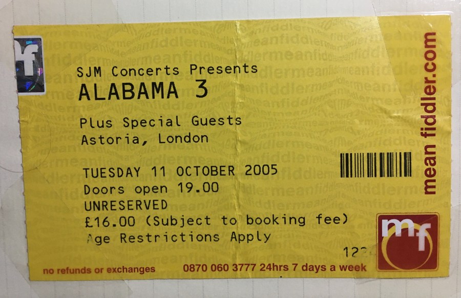 If this season of blogging about Gigs I Have No Diary Entries For is difficult, at least for most of the them I have my overarching love and interest for the band in question to help me come up with at least a vaguely interesting account of the night. When it comes to Alabama 3, however, I have next to nothing. In some ways, this gig is entirely unlike any that came before it, with the possible exception of my Gig Zero – the one I went to before I knew or cared about what gigging actually means. This is the first gig since then that I went to purely as a social event. I had no great interest in the band, but my Glam Best Friend had tickets, and so I went along.