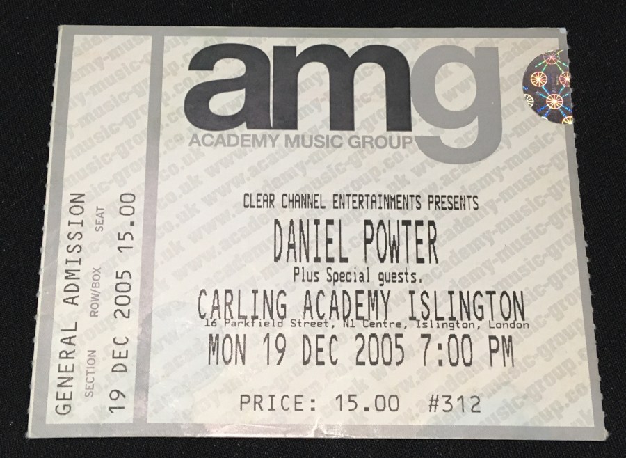 This was my last gig of 2005, and like the David Gray gig a few days previously, I attended it with with Crush Boy, in an attempt to repair some of the damage done to our friendship after he’d decided to pursue a relationship with someone else. However, two things made this gig a much, much happier time than the previous one: (a) Crush Boy’s new girlfriend did not come along and (b) as mentioned, I actually really liked Daniel Powter’s songs.