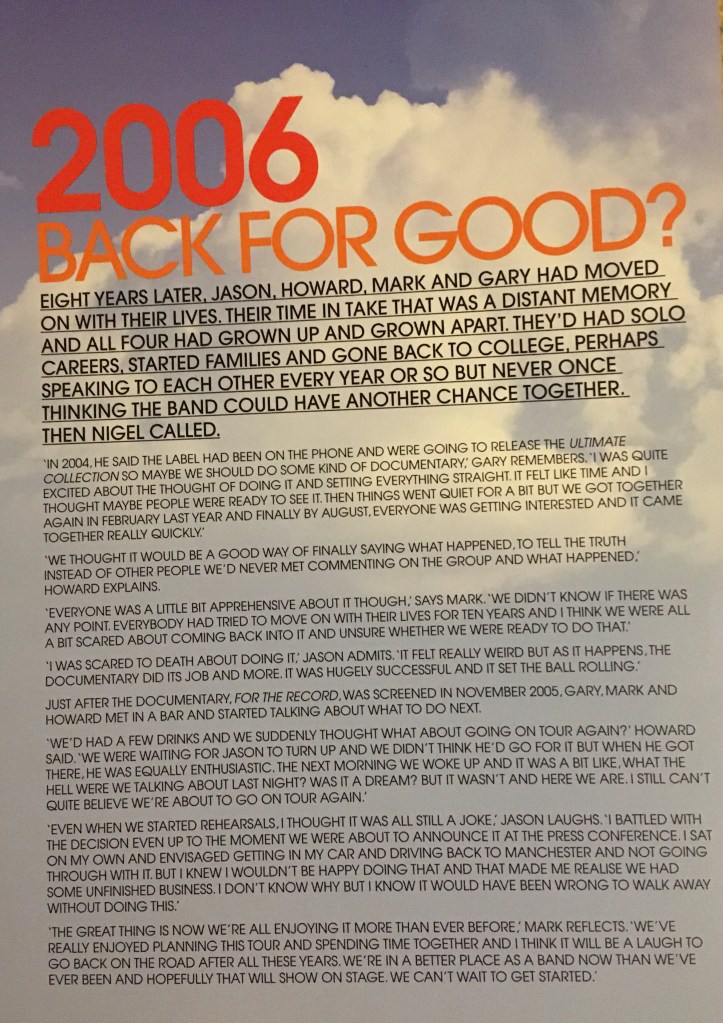 Of course, time passed, and Take That fans moved on. I distracted myself by focussing on my other favourite bands, and of course I finally did make it to London at the end of 1996. I was able to see both Robbie and Mark in fantastic solo gigs over the course of the following decade, and it never even remotely occurred to me that the boys would consider reforming. But then came November 2005 – just over ten years since I’d seen them as a four-piece in Perth – and they held a press conference to announce that once again, the rumours were true. Happily for us, this time the rumours were good ones, and the greatest boy band of all time were back in existence, planning to head out on their “Ultimate” tour the following May.