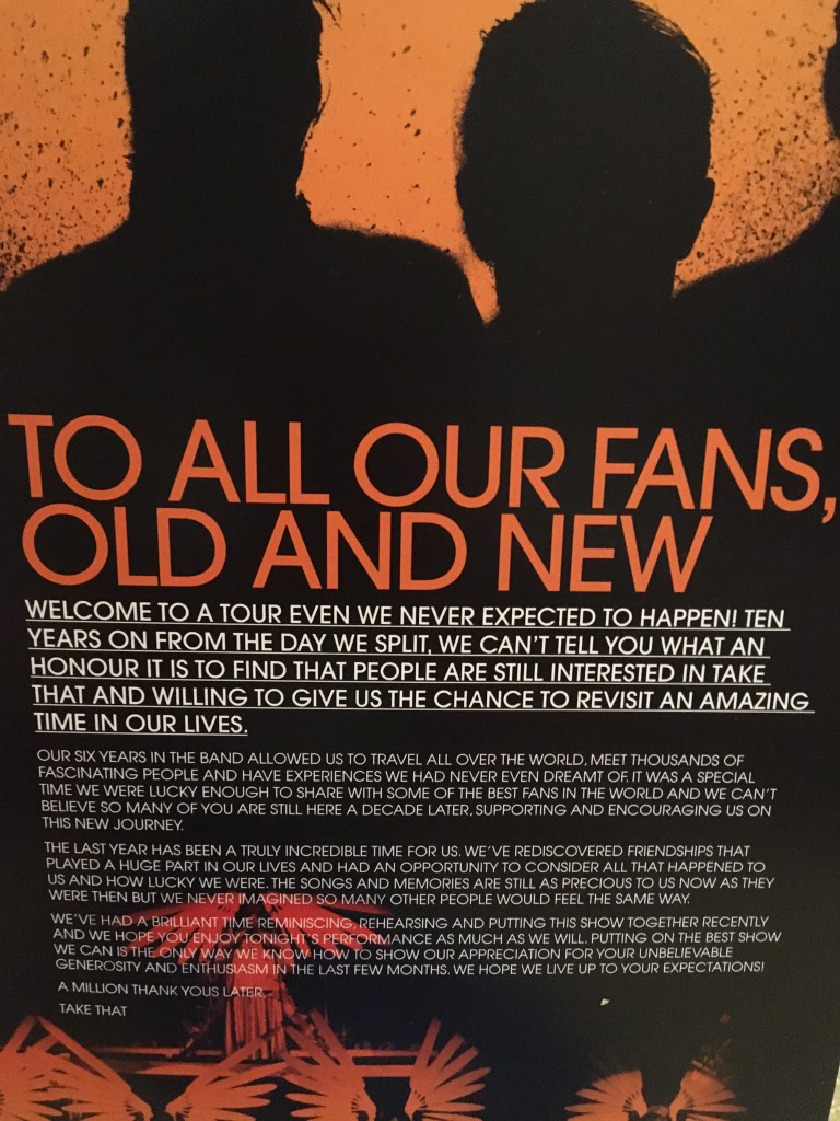 Sadly, this gig still occurred during a time when I was not recording my gig experiences in detail in my diary, and all I have to show for it is one curt sentence from the day before the gig – “In other news, I’m going to see Take That tomorrow“. Not quite the whirlwinds of excitement I would have imagined myself recording, had you told me on that fateful 1996 day that I would in fact get to see my boys live again one day. I really only remember one thing, which was that in a bizarre re-enactment of something that happened at my first TT gig in 1995, I was implored by a fellow fan to swap seats so that she could be near her friends. This saw me ending up several rows closer to the stage than I had previously been, and also enjoying a complimentary white wine which the woman I’d swapped seats with thrust into my hands a short while later as a thank you for making the switch.