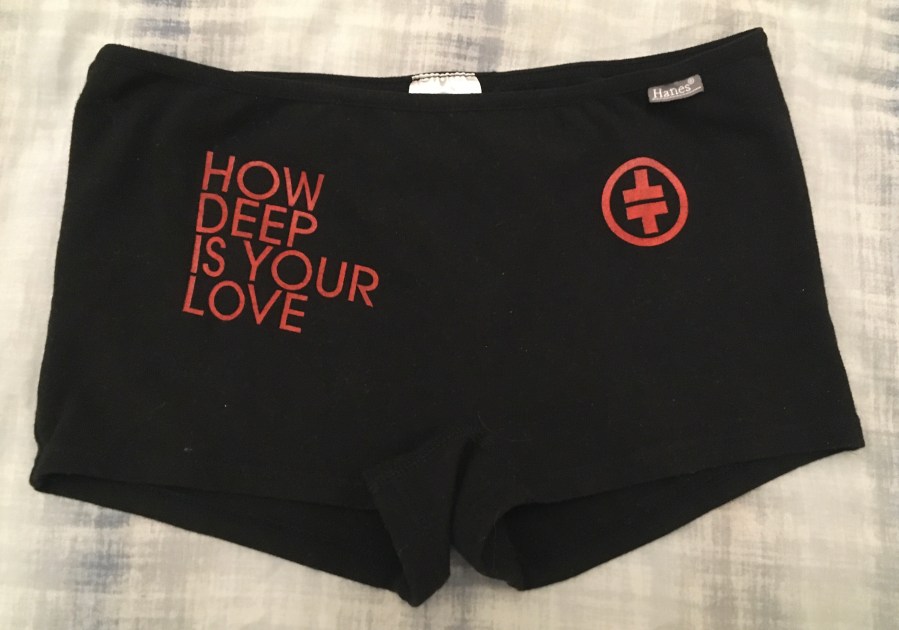 There are also some odd, overly-sexualised moments, not presented in a cheeky way as with Howard displaying his bottom in tours of yore, but a weirdly pornified way, such as the strippers cavorting in cages for “Why Can’t I Wake Up With You”. Perhaps this was also part of their attempt to appear as Real Grown Up Men and not the cute boys of before, but it lands uncomfortably. On the plus side however, it was perhaps this new sexiness-fixation that prompted them to create possibly the greatest bit of band merch of all time: the Take That knickers. I bought a pair, of course.