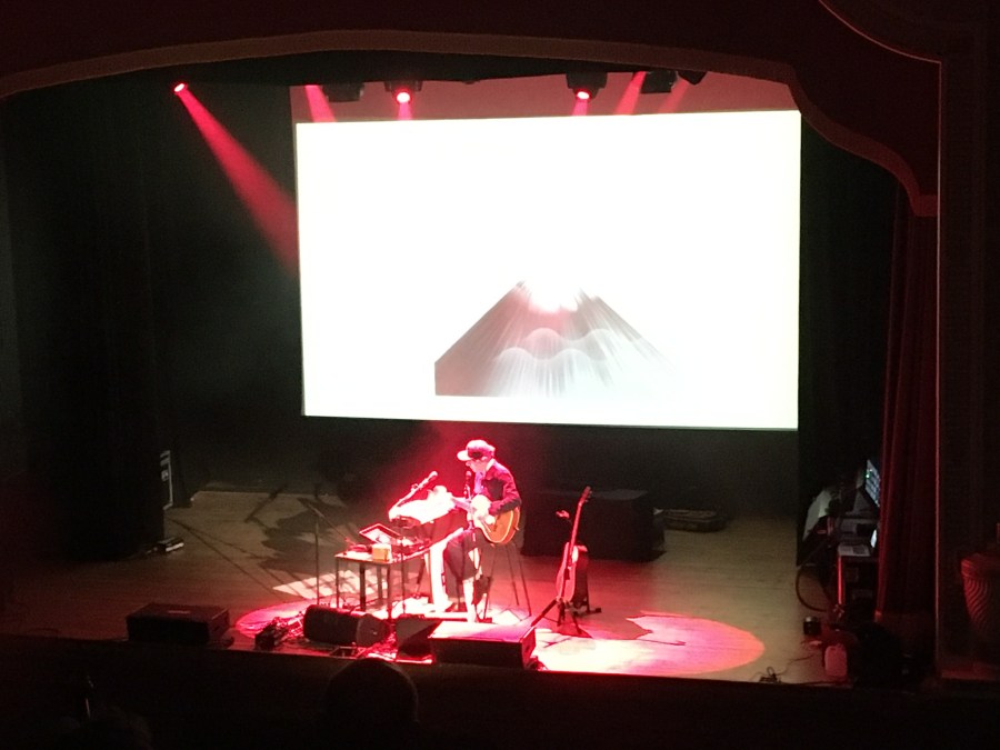 Then, with the help of a slide show of photos projected on the screen behind him, he took us through a selected history of his musical career. Beginning with a slide declaring “Fuck Off Everyone” (“please don’t” he plaintively added) he explained that this was the English translation of the name of his first band Ffa Coffi Pawb, and played one of their songs “Valium”, followed by the infectious “Pang!” and the American Wild West tinged “Iolo”. His voice retains all of its peaty, single-malt-whisky richness of years gone by, and hearing him perform these songs live, alone on stage accompanied only by an array of instruments, felt like a rare privilege.