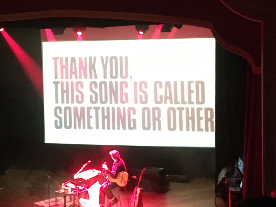 With a wit simultaneously sharp and warm, Gruff interspersed the songs with numerous stories and observations. He elucidated engagingly on the concept of a psychological group – such as those of us in that room who had all chosen to be there at that particular time – versus a physical group, who simply find each other in the same place randomly. He went through the evolution of his use of signs on stage, where printing errors led to “WHOA” coming out as “WOHA” and musing that “WOHA” was perhaps an apt description of how it feels to be in a gig crowd. Best of all, his story about singing with Damon Albarn and Paul McCartney, leading to a hilarious snapshot of McCartney’s expression when Damon held up one of Gruff’s sign proclaiming “Tax The Rich”, was worth the price of admission alone.