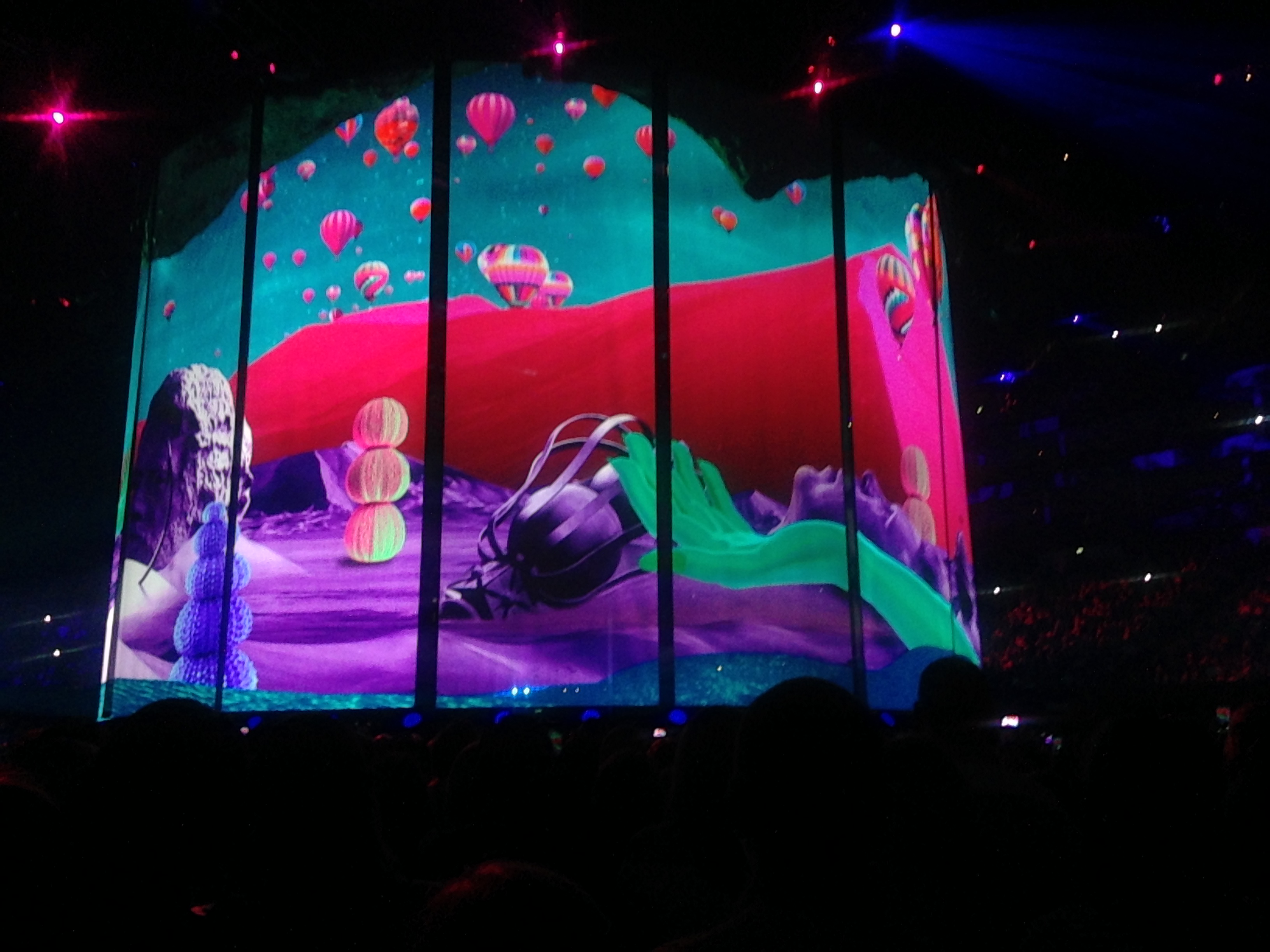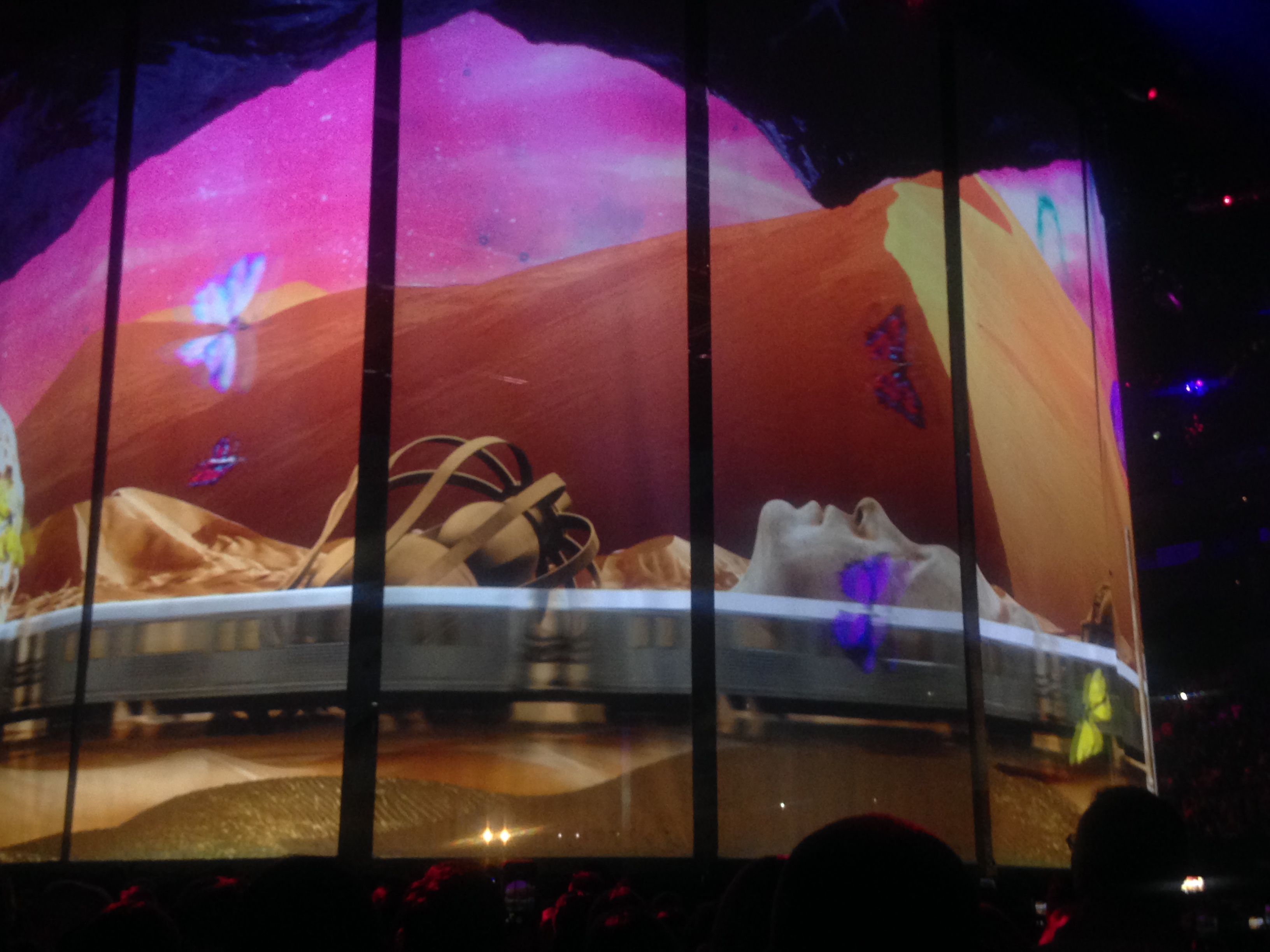 ‘Unfortunately, once Gary commenced singing the first verse, the O2 staff chose this moment to clear the pathway again, and we were pushed into a tight squeeze so that the rope barrier could return. I pretty much missed the first verse which was very annoying. Could they not have waited for “It’s All For You”? Mind you, that was probably the most awe-inducingly magical moment, Gary on a pink bed, Howard and Mark just spinning, and the swan and the unicorn and everyone throwing glitter.’
