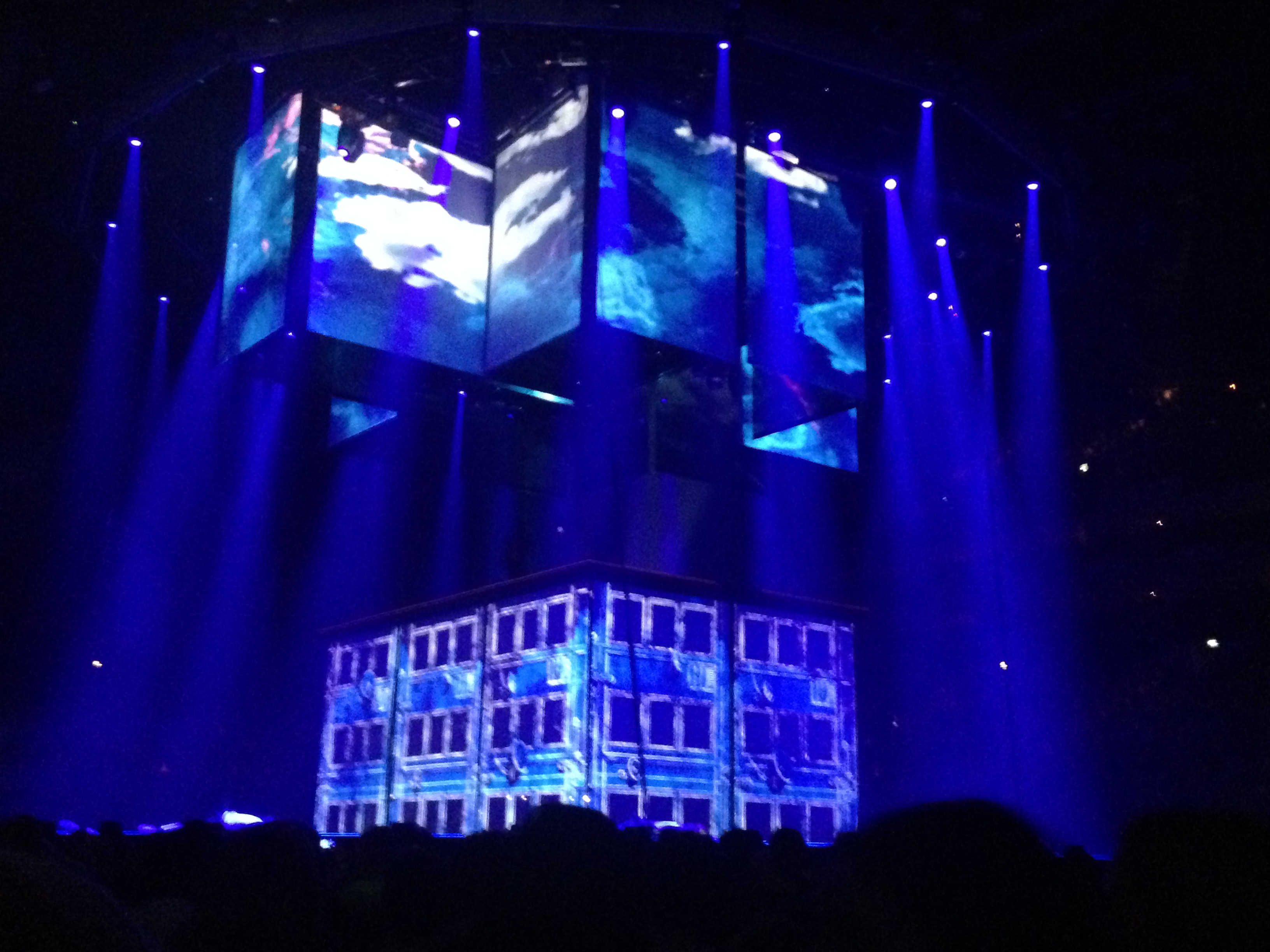 ‘And then it was “The Flood”, the three of them encased in a rainfall projecting images of their logo and the “Progress” silhouettes, and then they returned through their walkways, Howard at my end this time, and I had a swift grope of his back. They started “Cry” from their three respective corners of the arena before returning to the stage for a full-on rave. And then it was “These Days” and tho’ teetering on the edge of passing out from the heat and fatigue I was still not in control of my limbs and I danced and sang and held my arms aloft. Ditto the encores “Never Forget” and a phone light waving “Rule The World”.’
