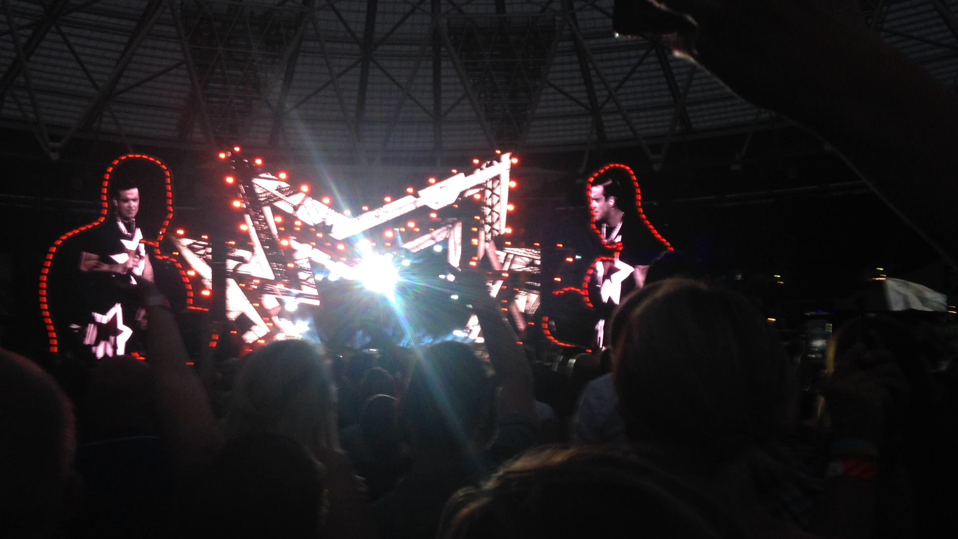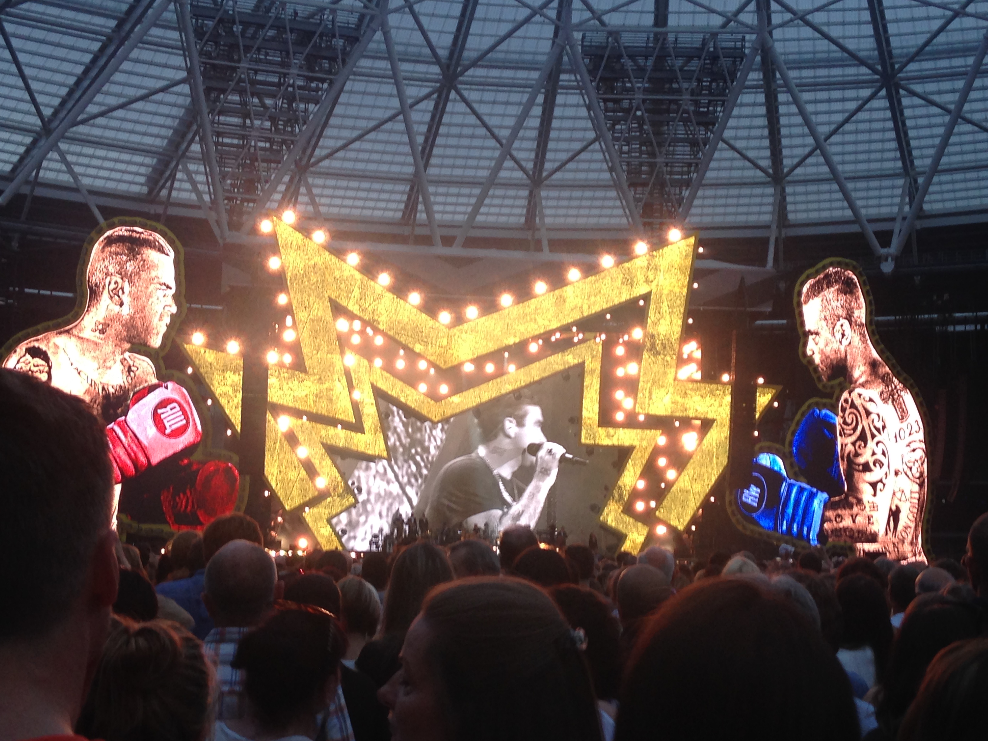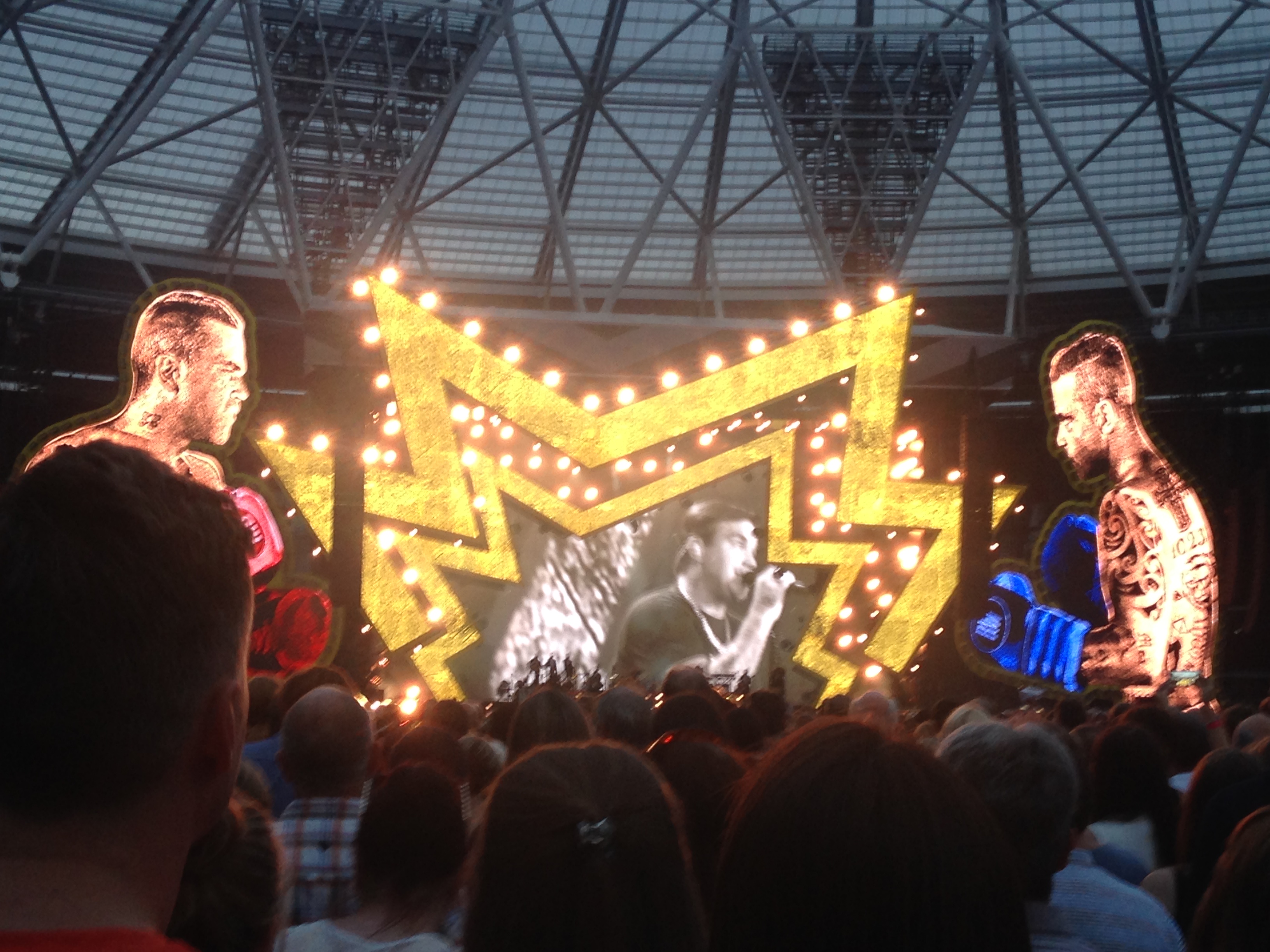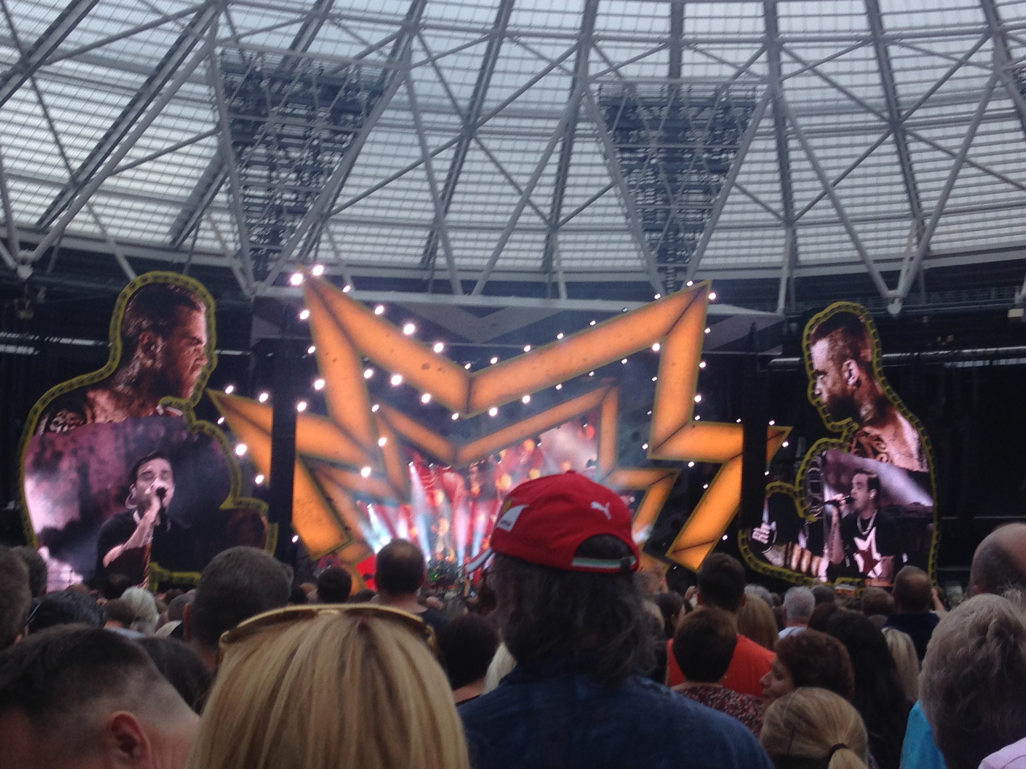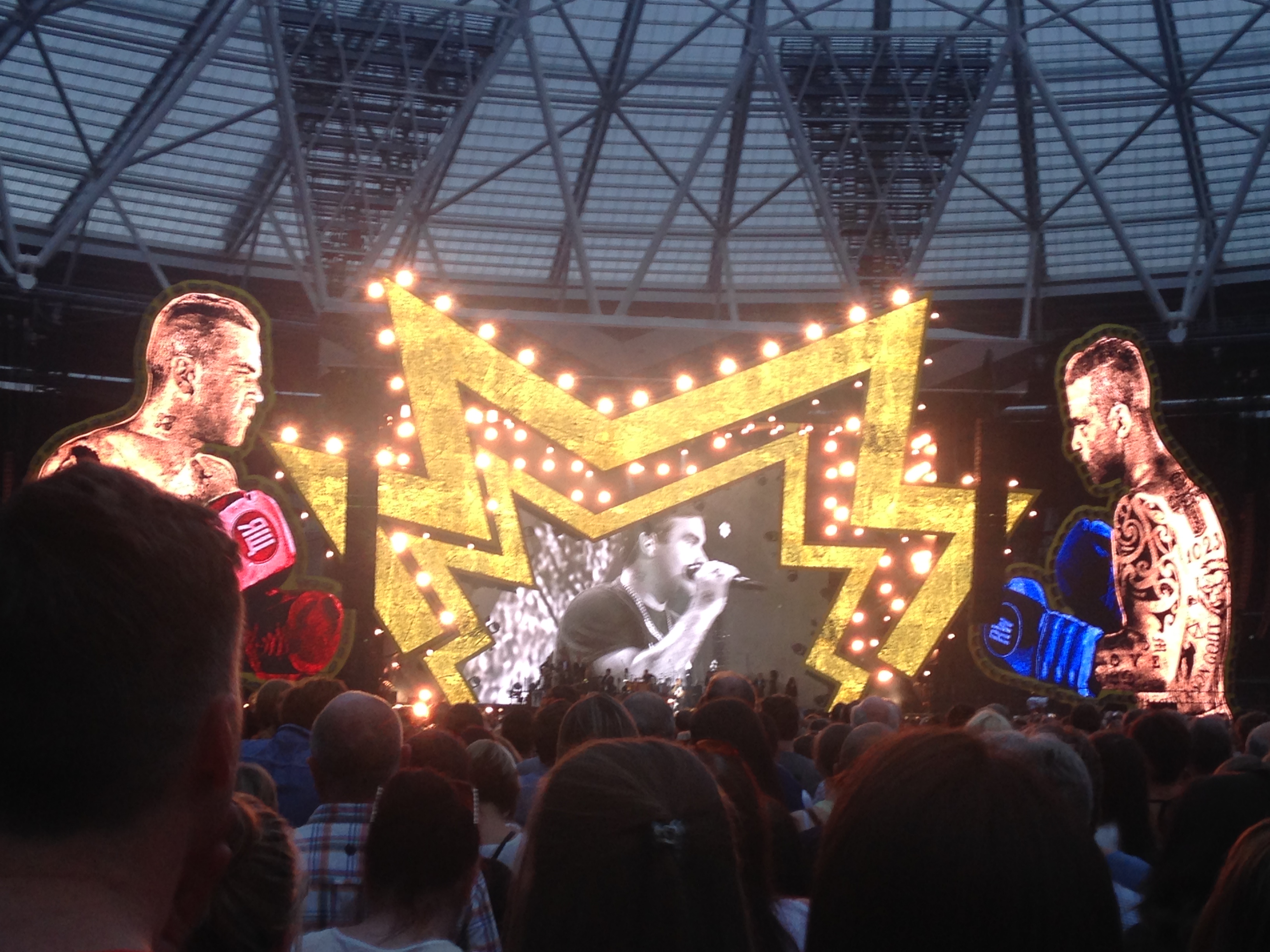 ‘Oh I did wish I’d been closer, I didn’t arrive ‘til about ten minutes before Robbie came on stage and I had a decent view about half way back, tho’ I had to change position a few times due to chatting wankers, seriously, who the hell pays £80 to have live Robbie as a backdrop for their inane conversation? But I do wish I could see him close up. As it was, I mostly just saw him on the giant Robbie-shaped screen, which was fine, really. He was in excellent voice, entirely recovered from the hoarseness that plagued him at the “One Love” show.