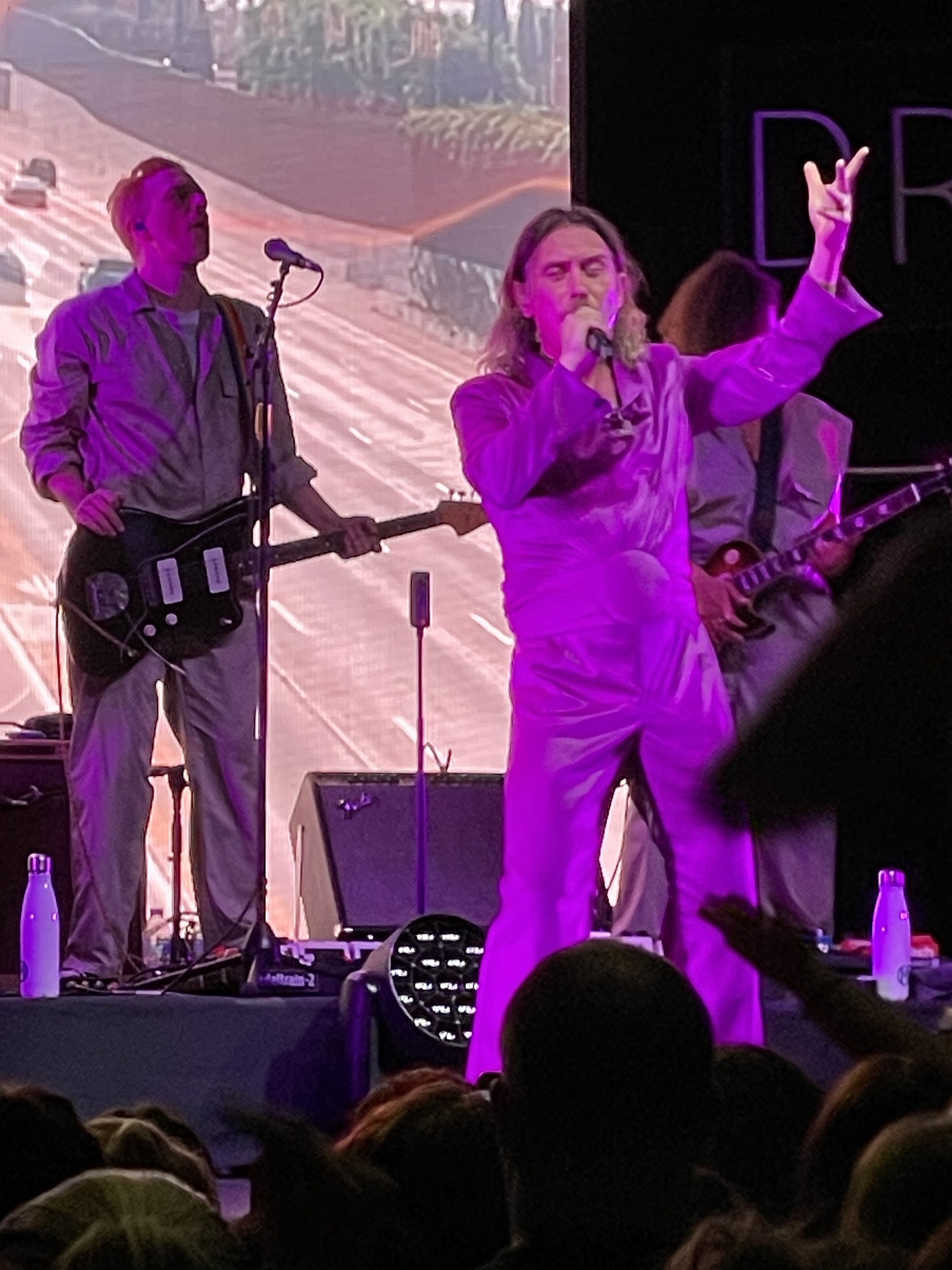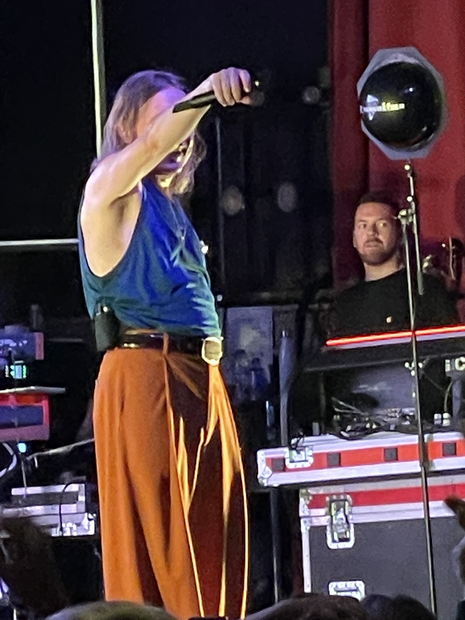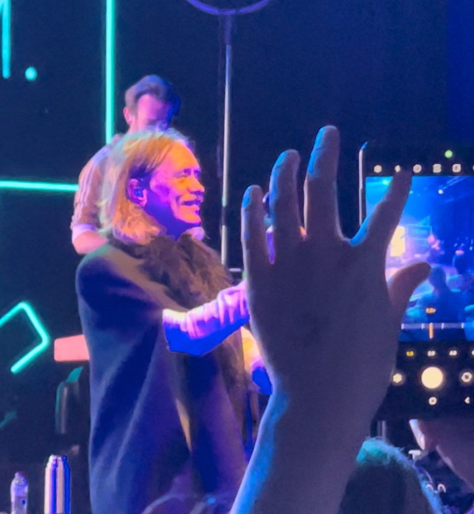 At the appointed time an alarm rang and the screen revealed Mark backstage, grooving his way through the opening track of “Land of Dreams”, “Superpower” while he moved through the backstage area towards the stage. I was further back than usually I’d like to be, but still had a pretty good view of him once he leapt onto the stage. From that moment, he powered through an extensive setlist of his own solo songs mixed in with a few choice Take That classics. His performance was suffused with enthusiasm and evident delight, and featured a dazzling array of outfits – first a bright and breezy mustard yellow suit, then a shiny purple ensemble ready for a 70s dancefloor, and finally, all in white.