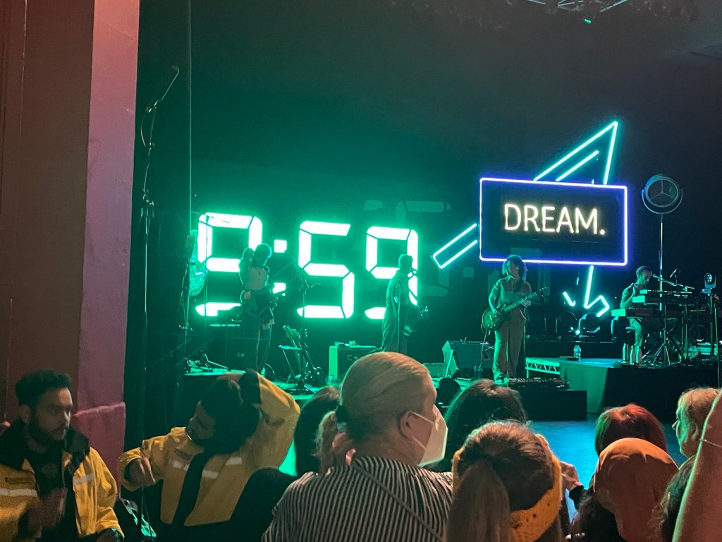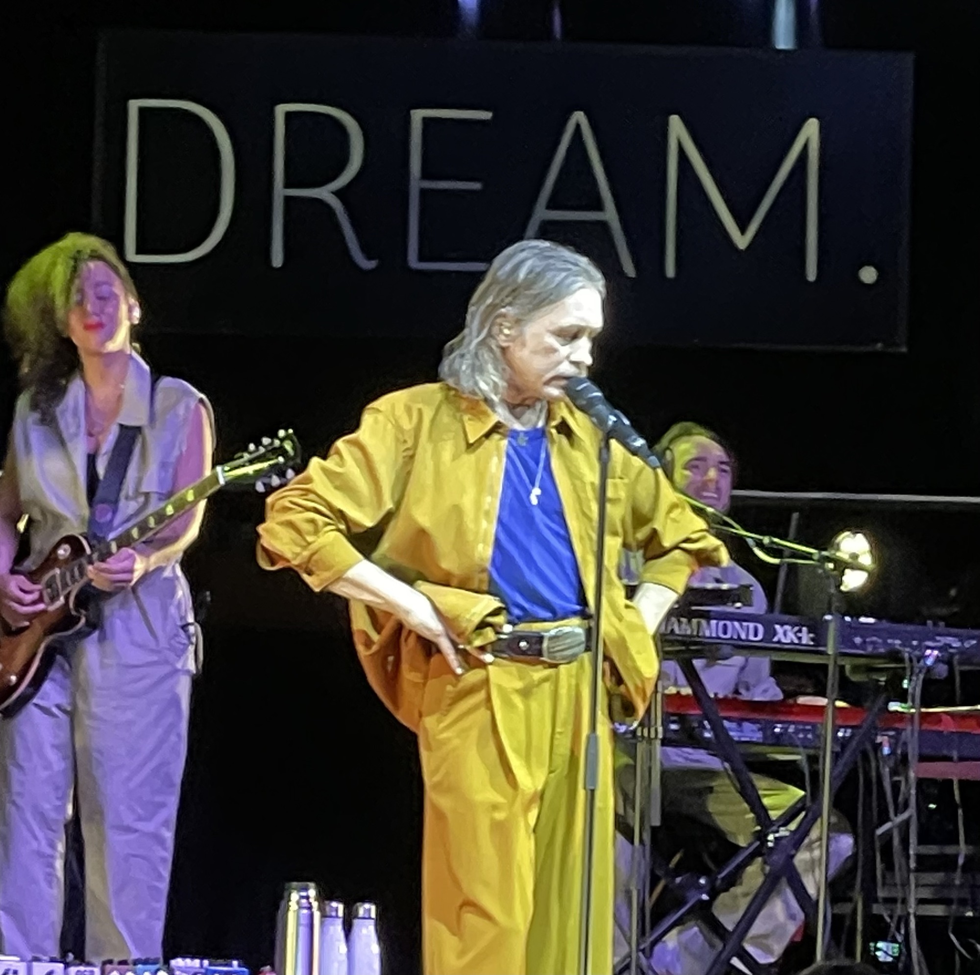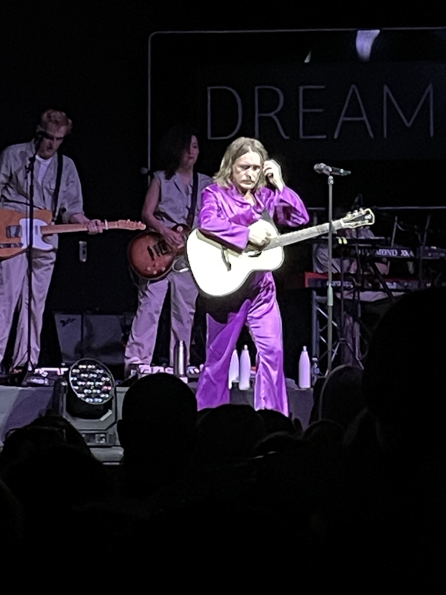 At the appointed time an alarm rang and the screen revealed Mark backstage, grooving his way through the opening track of “Land of Dreams”, “Superpower” while he moved through the backstage area towards the stage. I was further back than usually I’d like to be, but still had a pretty good view of him once he leapt onto the stage. From that moment, he powered through an extensive setlist of his own solo songs mixed in with a few choice Take That classics. His performance was suffused with enthusiasm and evident delight, and featured a dazzling array of outfits – first a bright and breezy mustard yellow suit, then a shiny purple ensemble ready for a 70s dancefloor, and finally, all in white.